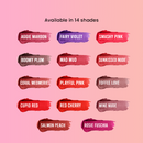 Shade: Aggie Maroon, Boomy Plum, Coral Memories, Cupid Red, Fairy Violet, Mad Mud, Playful Pink, Red Cherry, Rosie Fushsia, Salmon Peach, Smashy Pink, Sunkissed Nude, Toffee Love, Wine Nude